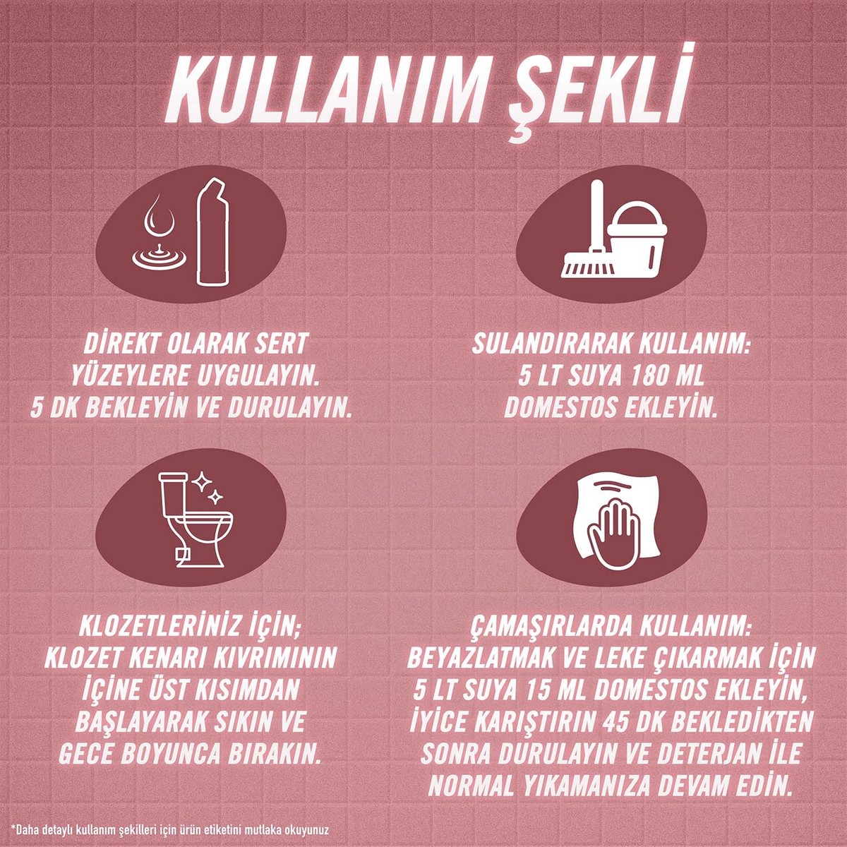 Domestos Çamaşır Suyu Beyaz Sabun Ferahlığı yoğun kıvamlı formülüyle maksimum hijyen sağlar. Beyaz sabun kokulu parfümündeki özel Aktif Ferahlık Teknolojisi ile kötü kokularda %100 etki gösterir, saatler süren ferahlık sağlar. Aynı zamanda güçlü formülüyle kireci önler; sifonu çekseniz de tuvalet yüzeyine tutunarak etkisini sürdürür. Asıl Etki (Dezenfeksiyon) Doğrudan kullanım: Gerekli yüzeylere uygulayın, 5 dakika bekletin ve durulayın. Klozetler: Klozet temizleyici olarak kullanmak isterseniz klozetin kenar kıvrımının içine üst kısmından başlayarak sıkın ve gece boyunca beklemeye bırakın. Mutfak / Banyo Lavaboları ve Lavabo Delikleri: Lavaboya döktükten sonra 5 dakika bekleyin, gerekirse fırça ya da bez yardımı ile yayarak köpürmesini sağlayın ve daha sonra bol su ile durulayın. Lavabo deliğine sıkarak kullanın. Sulandırarak Kullanım (Temizlik Etkisi) Yerler ve Geniş Yüzeyler: Yüzey ve yer temizleyici olarak kullanmak isterseniz 5 lt. suya 180 ml. Domestos Yoğun Kıvamlı Çamaşır Suyu ekleyin. Çamaşırlarda Kullanım (Temizlik Etkisi): Çamaşır beyazlatıcı ve leke çıkarıcı olarak kullanmak isterseniz 5 lt. suya 15 ml. Domestos ekleyin, iyice karıştırın, 45 dakika beklettikten sonra durulayın ve deterjan ile normal yıkamanıza devam edin. Daha yoğun kirler için 30 ml. Domestos ekleyin. Gece boyunca bekletecekseniz, kullanım miktarını yarıya indirin. Domestos Çamaşır Suyu Beyaz Sabun Ferahlığı temizlikteki yeni vazgeçilmezlerinizden olacak! Beyaz sabun kokulu parfümündeki özel Aktif Ferahlık Teknolojisi ile kötü kokularda etkili formülünü hemen deneyin, farkı hissedin. İçindekiler: <%5 Parfümn
