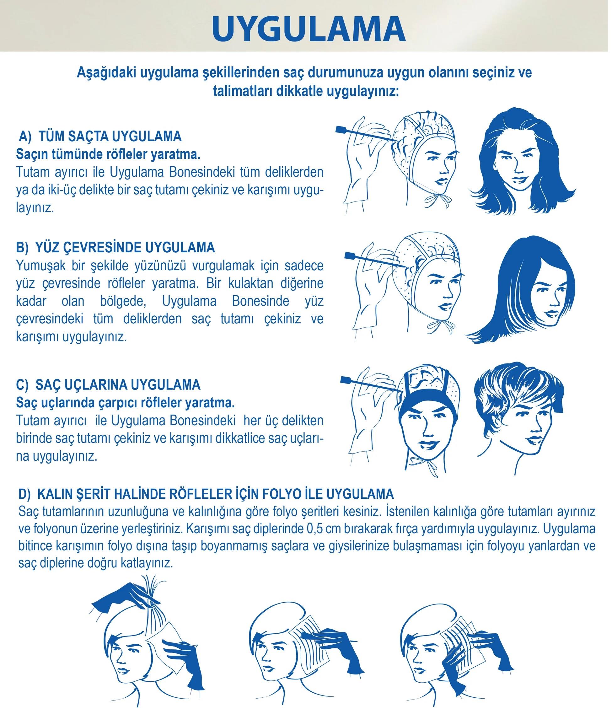 Saçınızı tarayınız ve Uygulama Bonesini (4) saçınıza sıkıca yerleştiriniz. Tutam Ayırıcı (6) ile Uygulama Bonesinden (4) eşit aralıklarla ince tutamlar çekiniz. Bunun için bone üzerindeki işaretleri kullanınız. Arzu ettiğiniz sıklıkta röfleler için işaretleri atlayarak uygulayınız. Tutamları çekerken bonenin üzerindeki delikleri genişletmemeye dikkat ediniz. Bu, daha fazla karışımın bonenin altına sızmasına ve saç diplerinin daha açık renk olmasına yol açabilir. Tüm tutamları çektikten sonra, çekilen saçların tekrar bonenin altına kaymasını önlemek için, çekilen saç tutamlarını köklerinden hafifçe ters yöne tarayınız. Giysilerinizi örtünüz, Koruyucu Uygulama Eldivenlerini (7) takınız. Uygulamadan sonra Bekleme Süresini mutlaka kontrol ediniz. Uygulanın sonunda boneyi saçınızdan çıkarmadan ılık su ile saçı durulayın. Daha sonra boneyi saçınızdan çıkarıp artan karışım ile birlikte atınız.